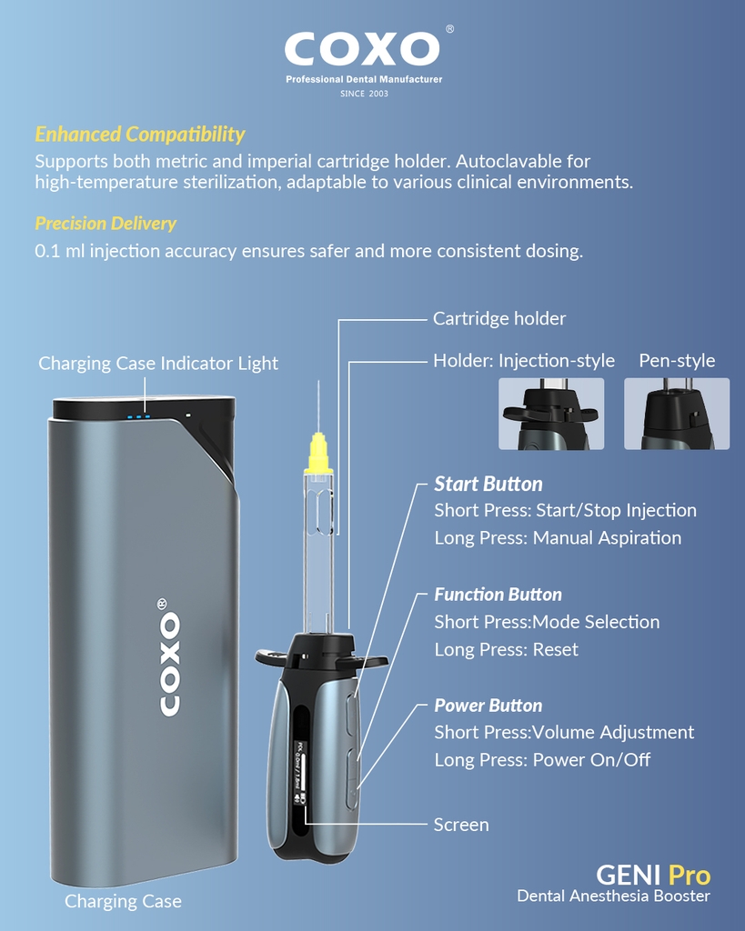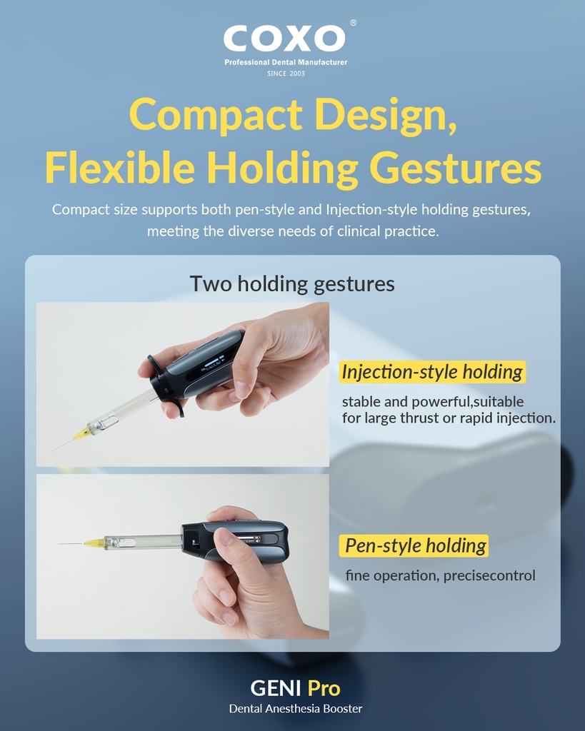Thao tác linh hoạt: Hỗ trợ hai tư thế cầm (kiểu cầm bút hoặc kiểu bơm tiêm truyền thống) giúp bác sĩ dễ dàng tiếp cận mọi vị trí trong khoang miệng.