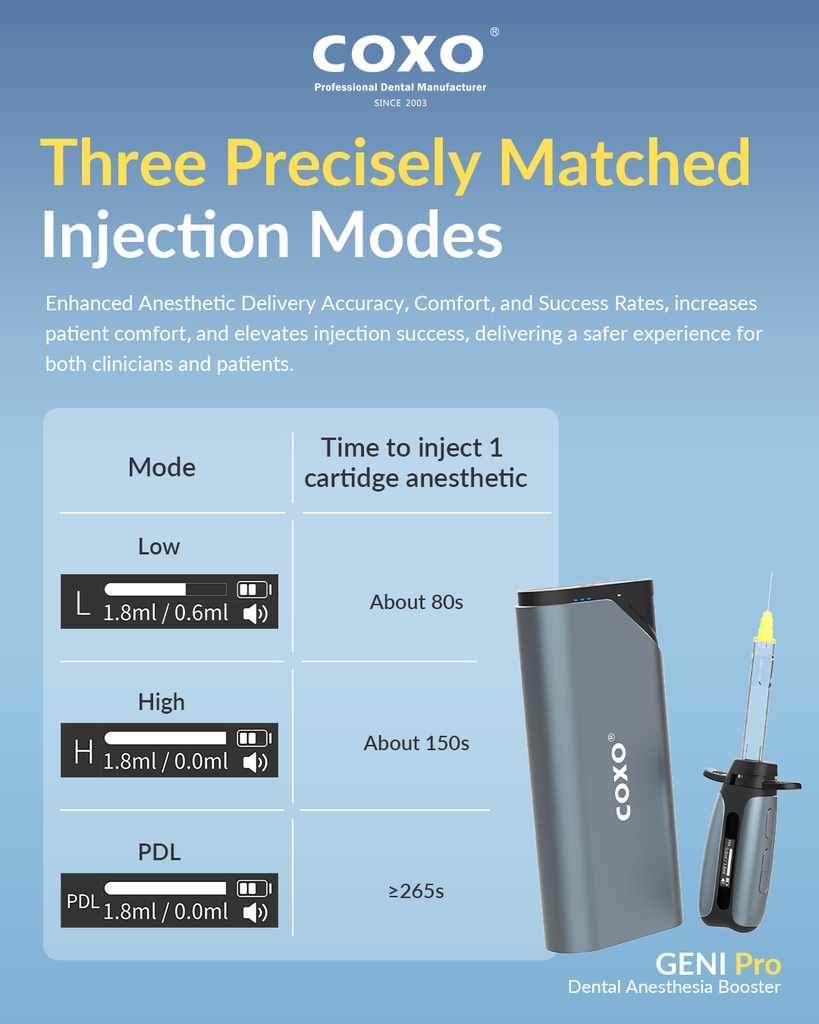Máy thiết lập sẵn 3 chế độ tiêm dựa trên lượng thuốc tê tiêu chuẩn là 1.8 ml: