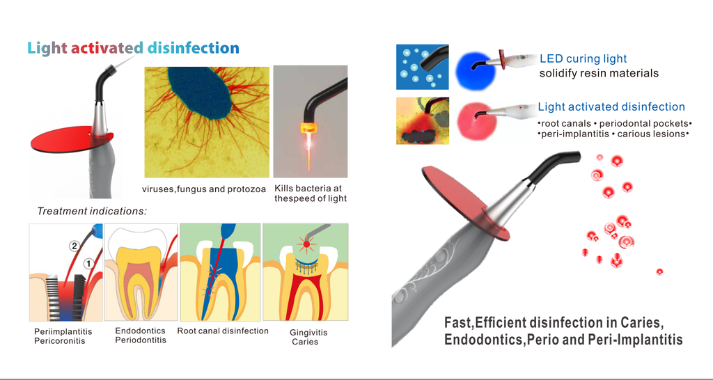 Trong đó Ánh sáng đỏ có tác dụng khử trùng, khử khuẩn nhanh chóng, hiệu quả, đơn giản, không có tác dụng phụ, giúp loại bỏ vi khuẩn trong điều trị: sâu răng, bệnh lý nha chu, implant, khử khuẩn ống tủy