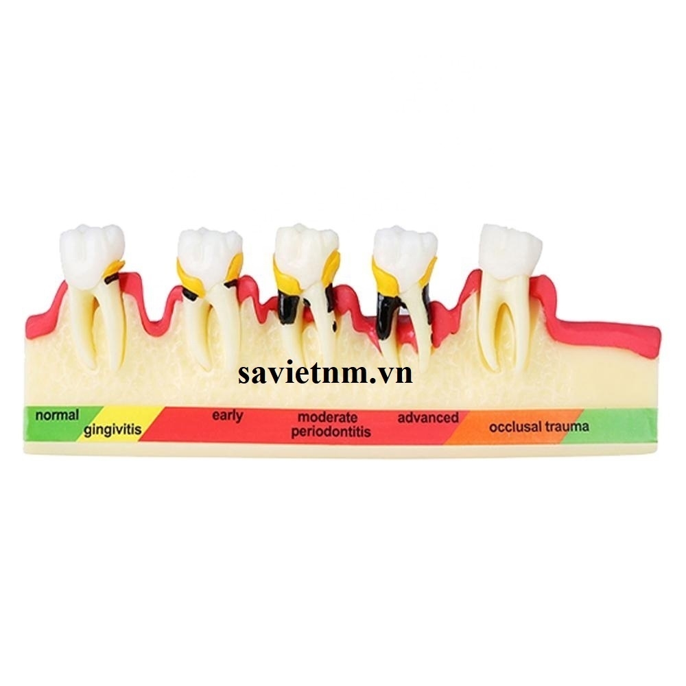 Tóm lại: Mẫu hàm này chủ yếu được sử dụng để tư vấn và giáo dục bệnh nhân về các giai đoạn phát triển của bệnh nha chu, từ viêm nướu nhẹ đến viêm nha chu nặng, và ảnh hưởng của nó đến nướu, xương và răng. Nó giúp bệnh nhân hiểu rõ hơn về tầm quan trọng của việc vệ sinh răng miệng và điều trị nha chu kịp thời để ngăn ngừa mất răng.