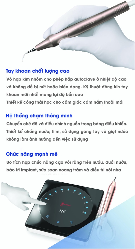 U6 Led tích hợp chức năng cạo vôi trên nướu, dưới nướu, bảo trì Implant, sửa soạn xoang trám và điều trị nội nha.