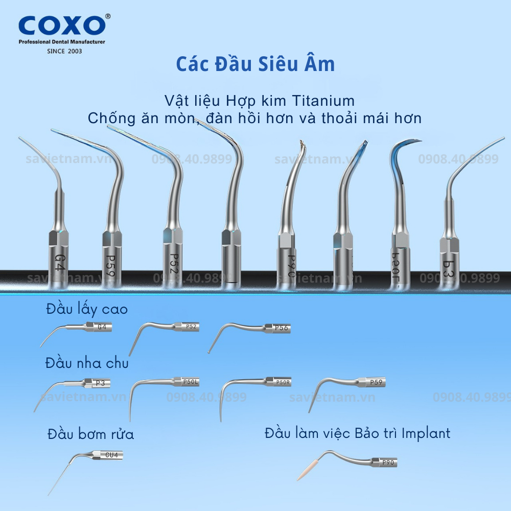- Đầu lấy cao răng ×17 (G4 ×2, P52 ×2, P56 ×2, P3 ×2, P59 ×2, P50L ×2, P50R ×2, P90 ×1, CU4 ×2)