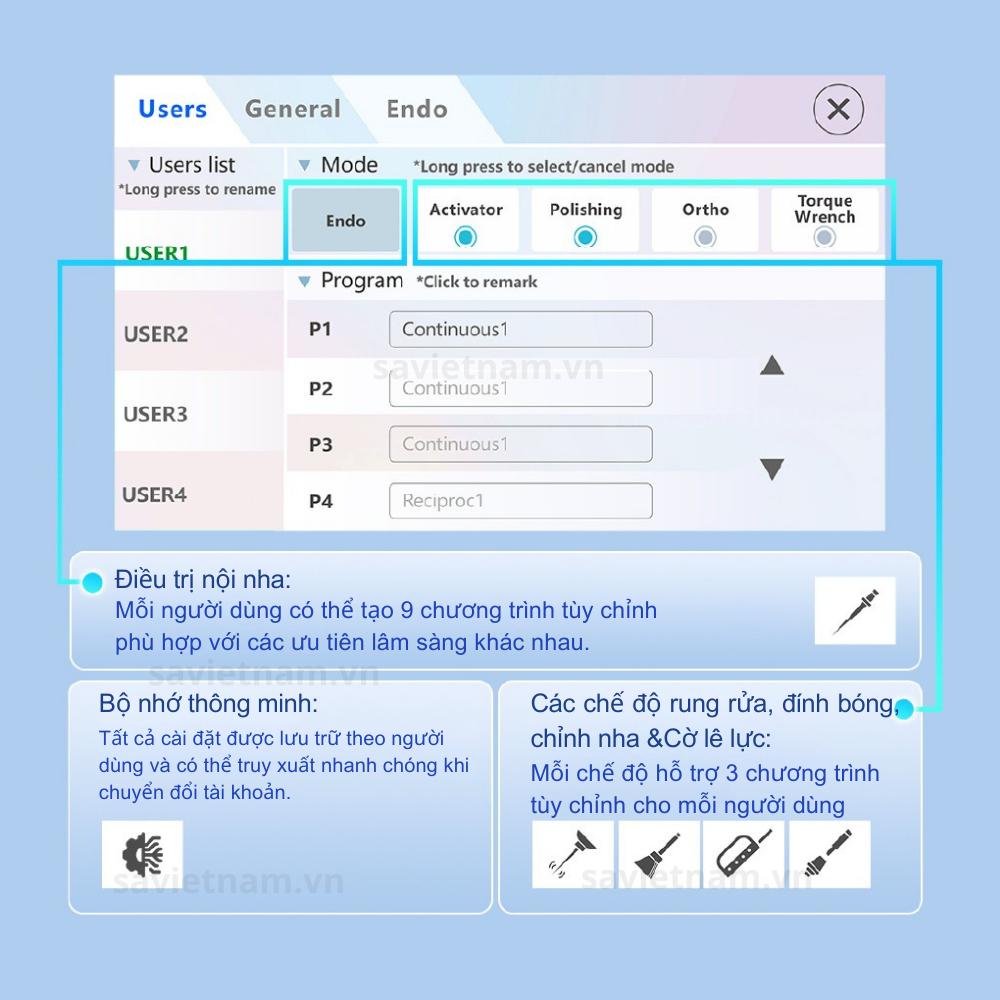 Cá nhân hóa chương trình: Mỗi người dùng có thể tạo 9 chương trình tùy chỉnh cho chế độ nội nha và 3 chương trình cho mỗi chế độ khác (Activator, Polishing, Ortho, Torque Wrench).