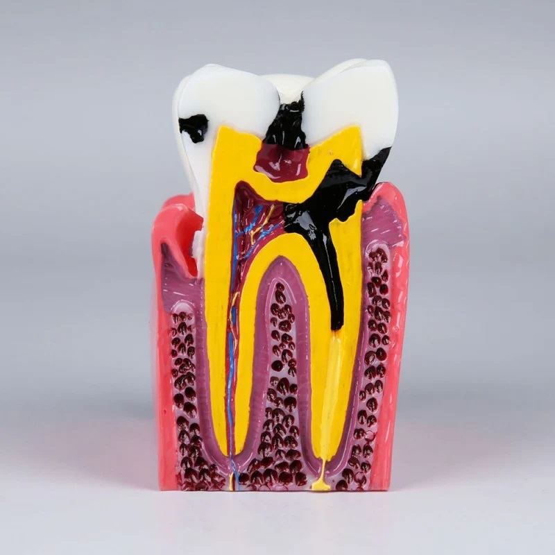 Tóm lại, mô hình này chủ yếu được sử dụng để giải thích về quá trình phát triển của sâu răng từ giai đoạn sớm đến khi gây ra các biến chứng nghiêm trọng như viêm tủy và viêm quanh cuống răng. Nó giúp người xem hình dung rõ hơn về tác động của sâu răng đến cấu trúc bên trong của răng và tầm quan trọng của việc phòng ngừa và điều trị sâu răng kịp thời.