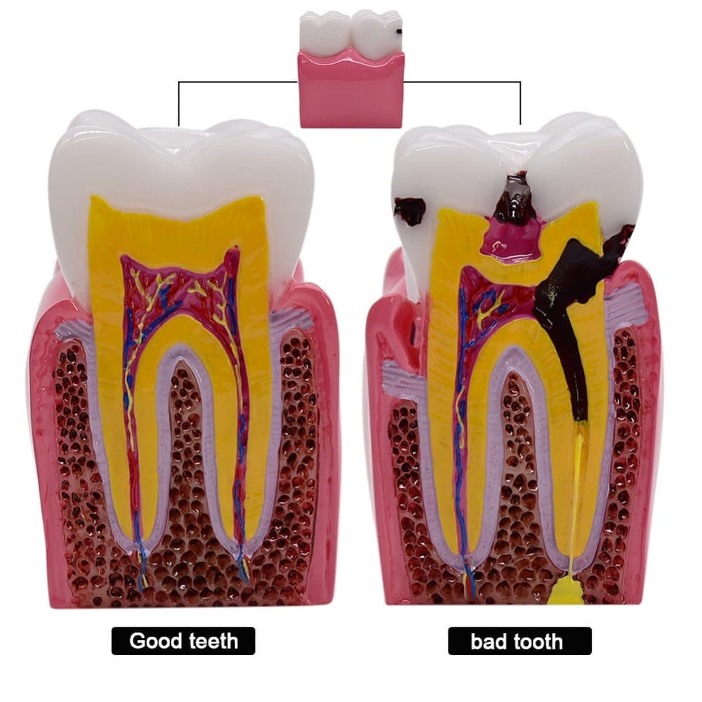 Mô hình so sánh sự khác biệt giữa một chiếc răng khỏe mạnh và một chiếc răng bị sâu, đặc biệt là những ảnh hưởng của sâu răng đến các cấu trúc bên trong răng.